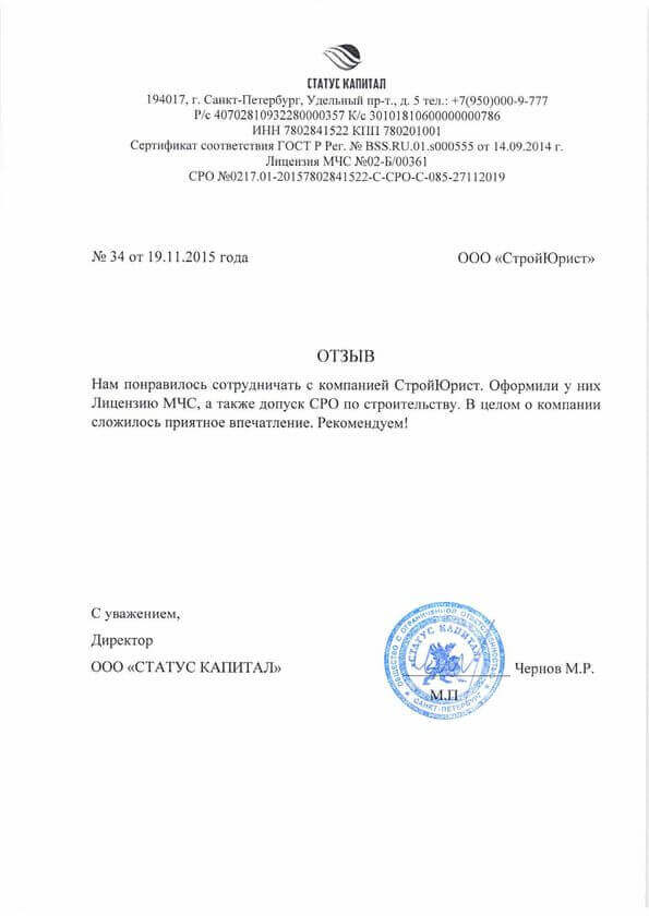 Отзывы клиентов "СтройЮрист" по лицензированию МЧС в Подольске