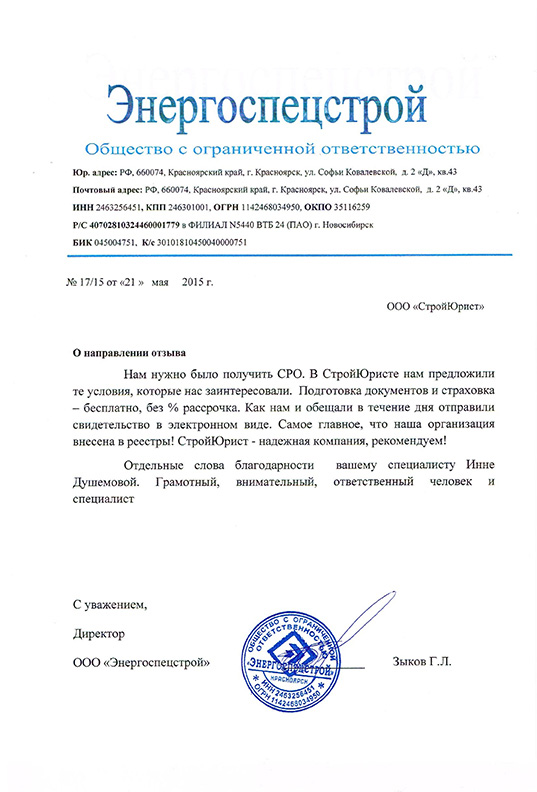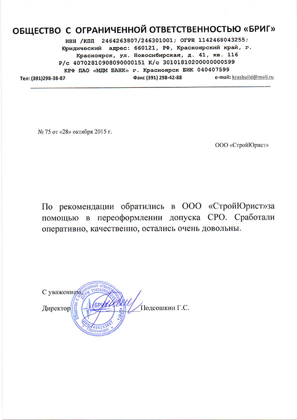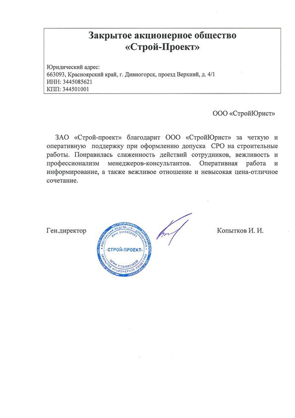 Отзывы клиентов "СтройЮрист" по вступлению в СРО в Подольске